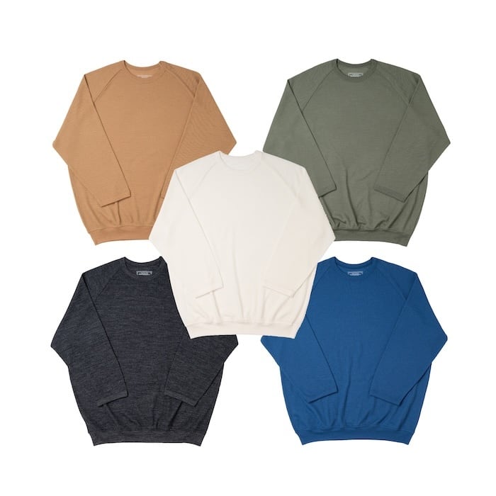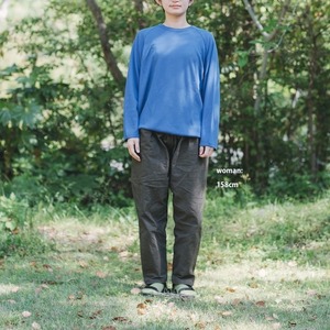 素材は軸糸にポリエステルのフィラメント糸、カバー糸にニュージーランドメリノウールとCOOLMAX®の混紡糸を使用したワッフルジャージー。メリノウールの持つ優れた調温・調湿機能と天然の強力な消臭作用にCOOLMAX®の吸水速乾性も掛け合わせたハイブリッド素材のため、旅の最中の洗濯の煩わしさから解放され、たとえ洗濯してもすぐに乾いてくれることで身軽に旅に出かけられます。また表面に凹凸のあるワッフル組織は生地が直接肌にあたる面積が小さいため張り付く不快感が少なく、暑い時期は1枚で着用すれば風が抜け、寒い時期は生地と体の間に空気の層をつくり、暖かく過ごすことができます。