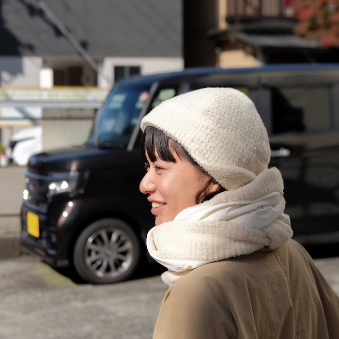 バンド部分は生地を二重に仕立てていますので耳や首筋を冬の冷気からしっかりと守り、一枚仕立てのトップ部分は蒸れを逃し、行動量が多くなってヒートアップしてしまっても耳あてを跳ね上げることで体温調整が簡単にできます。