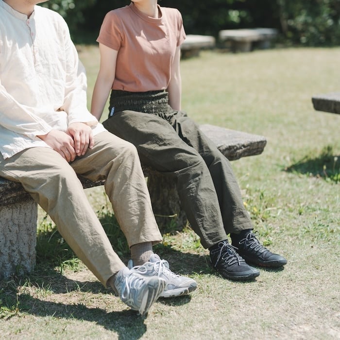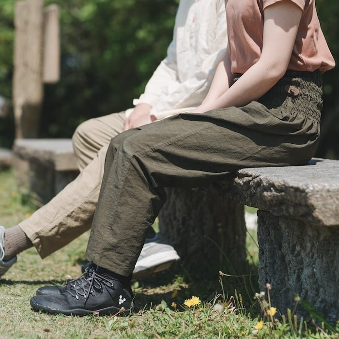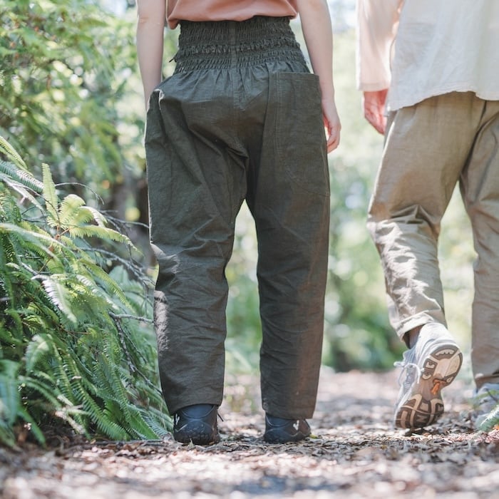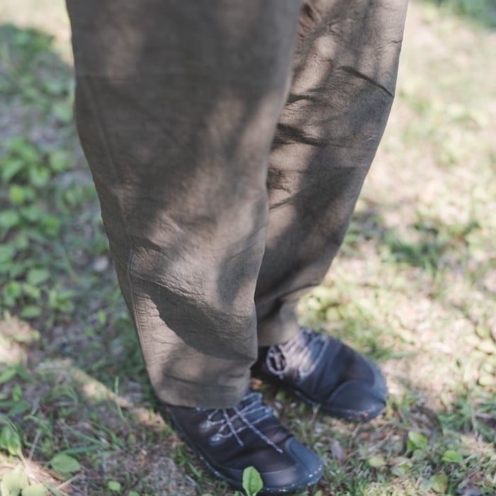 主に女性の野良着とされていたもんぺは大変動きやすく機能的で、造りにも無駄がありません。そのもんぺの良いところをそのままに、様々な体型にフィットするように私たちなりに見直したのが「モンペズボン」です。