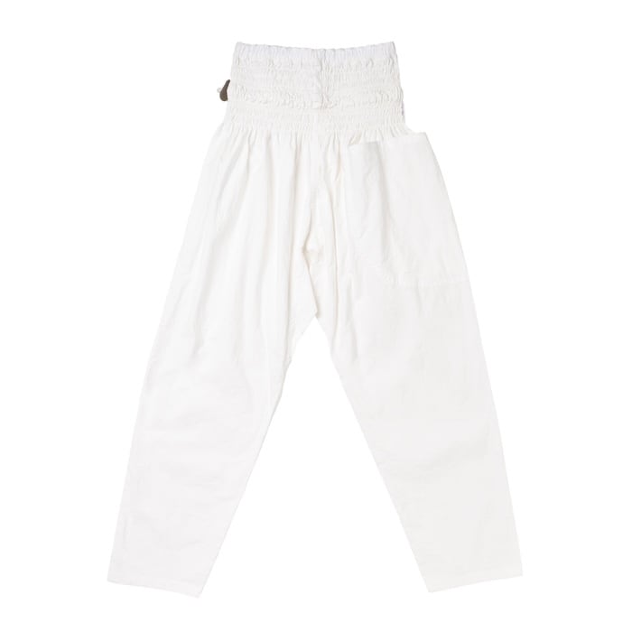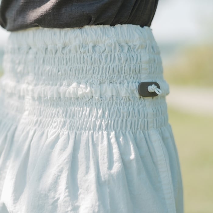 ウエストの細い方や、モンペズボンの大きなポケットに重量のある荷物を入れるような場合はコードゴムを引き締めることでズボンのずり下がりを防ぎます。