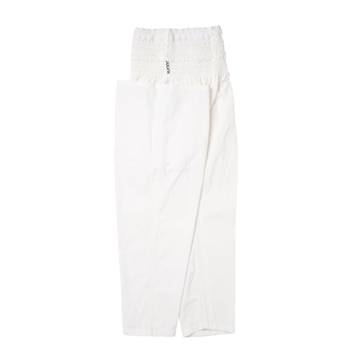 モンペズボンの特徴的なウエストは「平ゴム」「シャーリングゴム」「コードゴム」とそれぞれ締め付け感の違う3種類を組み合わせて成り立っています。